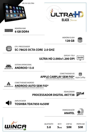 CENTRAL MULTIMÍDIA ANDROID WINCA ULTRA+ 6/128GB 4G BLACK SERIES 9P - UB-916128-CPAA