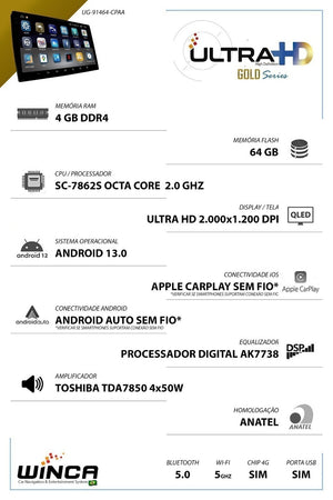 CENTRAL MULTIMÍDIA ANDROID WINCA ULTRA+ 4/64GB 4G GOLD 9P - UG-91464-CPAA